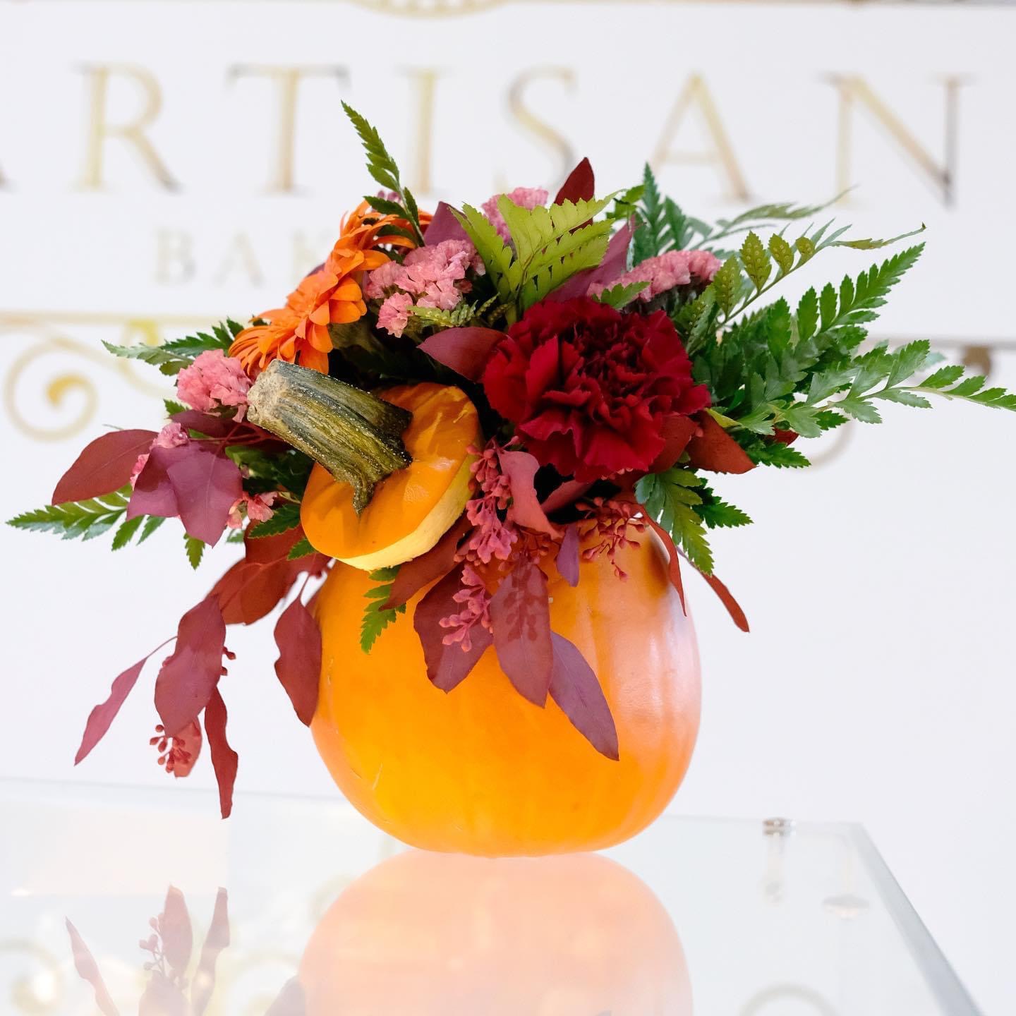 Thanksgiving Pumpkin Flower Arrangement is available by pre order.