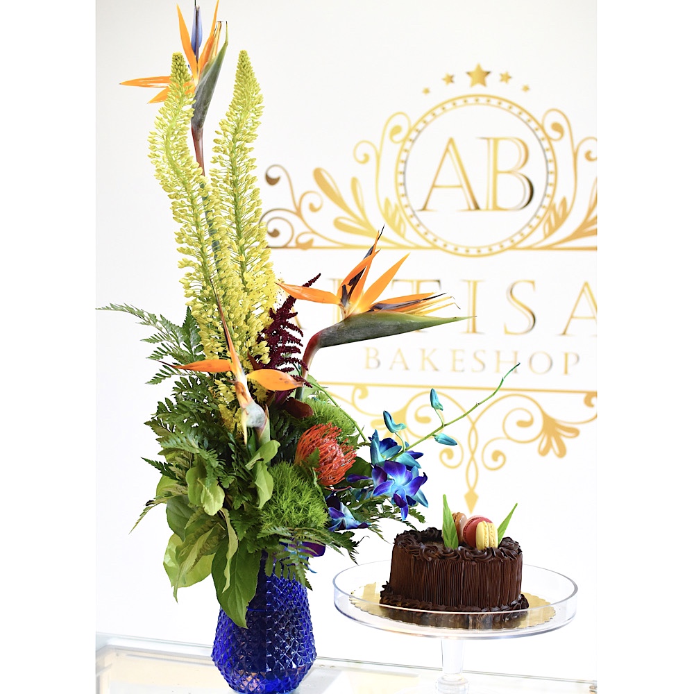Tropical Flower Arrangement and 6’ Macaron Chocolate Truffle Cake